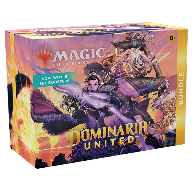 The Dominaria United Bundle contains 8 Dominaria United Set Boosters—the best boosters to open just for fun—plus exclusive accessories, with 40 basic lands (20 traditional foils and 20 nonfoils), 1 Traditional Foil promo card with Bundle-exclusive alternate art, 1 oversized Spindown life counter, 1 card storage box, and 2 reference cards.