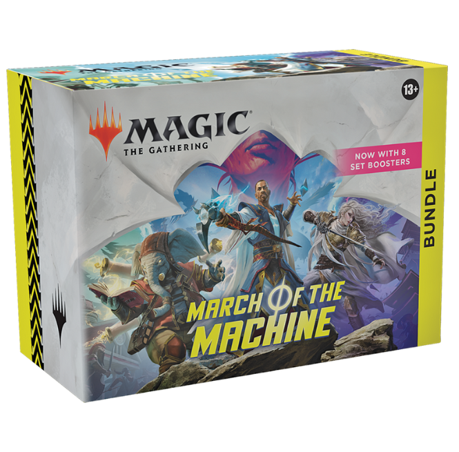 The March of the Machine Bundle contains 8 March of the Machine Set Boosters—the best boosters to open just for fun—plus accessories, with 1 traditional foil alternate-art promo card, 40 basic lands (20 traditional foils and 20 nonfoils), 1 oversized Spindown life counter, 1 card storage box, and 2 reference cards.