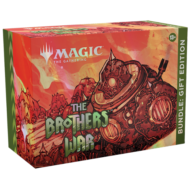 The Gift Bundle also contains 8 The Brothers’ War Set Boosters, 40 basic lands (20 traditional foils and 20 nonfoils), 1 traditional foil alternate-art promo card, 1 exclusive oversized Spindown life counter, 1 special Gift Edition foil card storage box, and 2 reference cards.