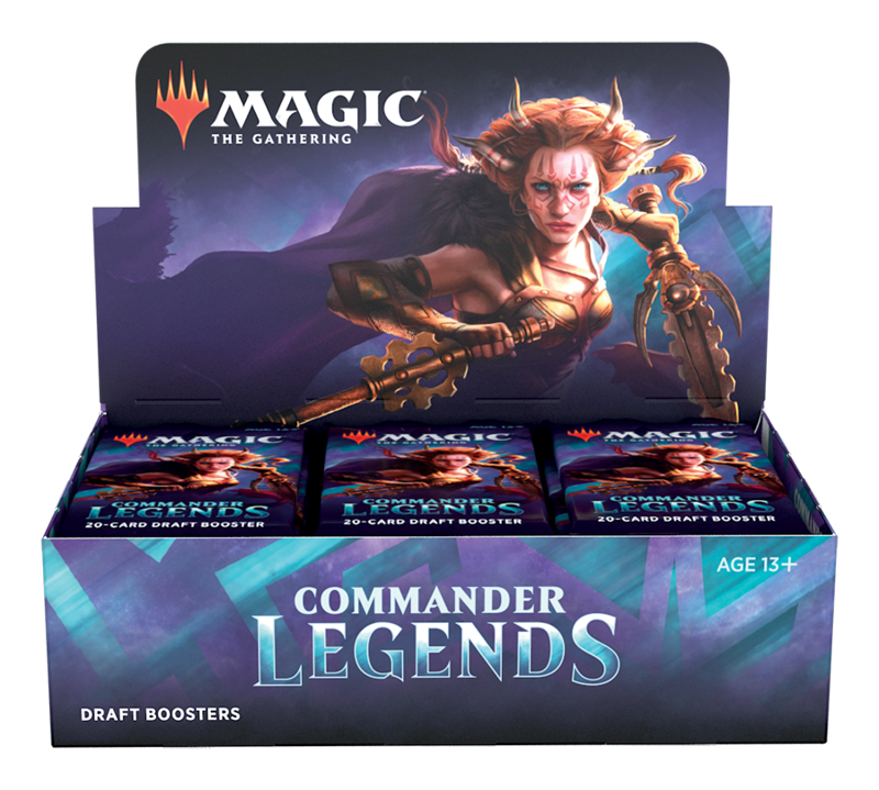 Magic the Gathering Commander Legends factory sealed Draft Booster Box containing 24 Draft Booster Packs each containing 20 cards, including 2 Legendary Creatures and 1 Premium Card.