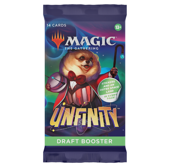 Every Unfinity Draft Booster comes with a full-art land. Usually, it will be a planetary space-ic basic land, but roughly one in four Draft Boosters will contain an orbital space-ic land, and roughly one out of every 24 Draft Boosters contains a borderless shock land.